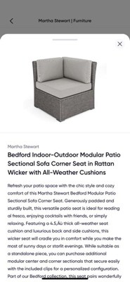 [This review was collected as part of a promotion.] The Martha Stewart Bedford, indoor outdoor modular patio sectional sofa corner seat in the rattan wicker with all weather cushion is a very nice outdoor seat. It is comfortable, and I like the design and the color and it is easy to put together.