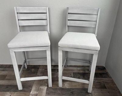 Martha Stewart Bedford Set of 2 Indoor-Outdoor Patio Bar Stools with Brown Brushed Woodgrain Aluminum Finish and Cream All-Weather Seat Cushions