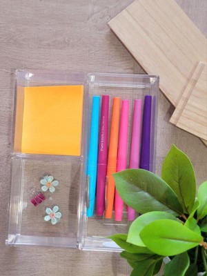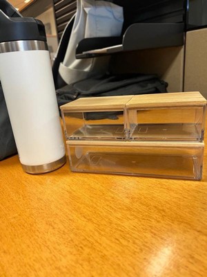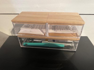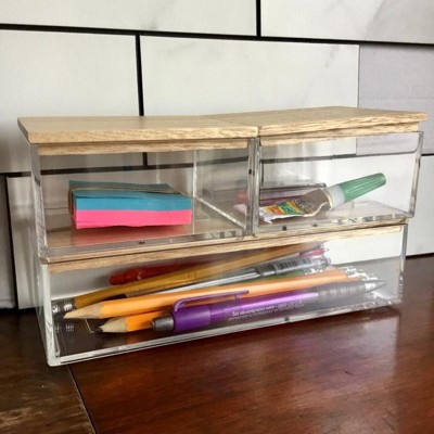 [This review was collected as part of a promotion.] These little organizers are so cute! The longer one is perfect for pens/pencils (or if you use a cricut, it’s great for the weeding tools), and the top two smaller bins are good for paper clips, etc. I have a small business so I use them for my package inserts. The plastic seems sturdy and the wood lids are a nice touch!