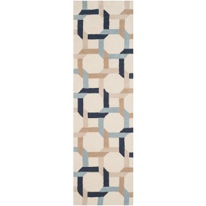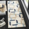 The runner's intriguing pattern draws the eye, featuring a harmonious blend of abstract geometric shapes in a chic palette of zinc, complemented by hints of soft cream and rich blue shades. This contemporary design is versatile enough to complement a range of interiors, adding a touch of modern flair without overwhelming your space.