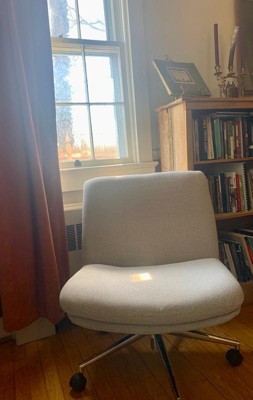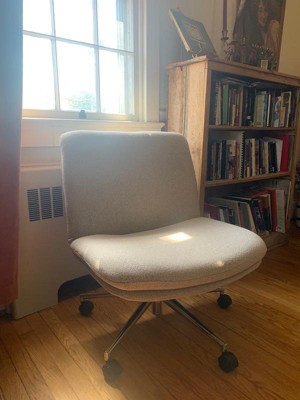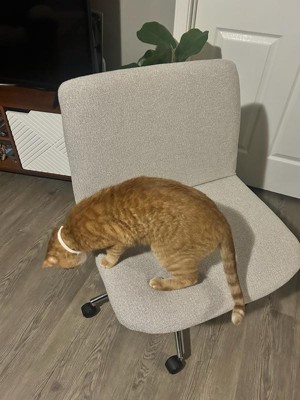[This review was collected as part of a promotion.] The Eloise Upholstered Office Chair is comfy, stylish, and perfect for long workdays. The extra cushioning and wide seat (great for sitting cross-legged!) make it super cozy. It looks sleek with the polished nickel frame, and the swivel and height adjustments are smooth and easy. Assembly was simple, and cleaning is no fuss. Bonus: my cat has claimed it for his afternoon naps—he definitely approves!