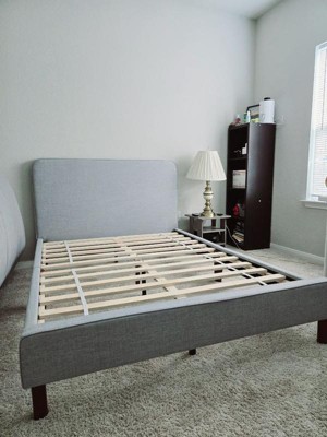 [This review was collected as part of a promotion.] Wow! I’m so genuinely impressed with the quality of this bed. It is such a great value for the money. Instructions were pretty easy to follow and bed was pretty quick and easy to put together. It took us about an hour. All materials are pretty good quality and bed looks and feels pretty sturdy. It’s full size bed and is nice upgrade to my 7 yo daughter bedroom. It’s pretty simple but at the same time stylish upholstered platform bed. I like that it doesn’t need any spring box and sits farely low only 6 inches from the ground. I put 12 in mattress on it and it’s perfect for the child. She loves it and said it’s very comfortable. 6 in highs gives pretty good space for storage underneath the bed. This bed has pretty good, sturdy legs, they are round and wide, they provide good support. Wood slat bottom hold mattress pretty well, it can hold up to 500 lbs with good support.
