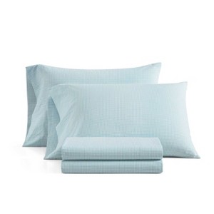 - The Martha Stewart Small Gingham Printed Sheet Set Features A Classic Gingham Pattern In A Soft Blue, Printed On A Crisp White Ground