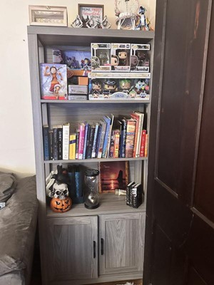 Product Name: Martha Stewart Hutton Four Tier Shaker Style Bookcase with Storage Cabinet in Gray with Brushed Nickel Hardware