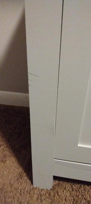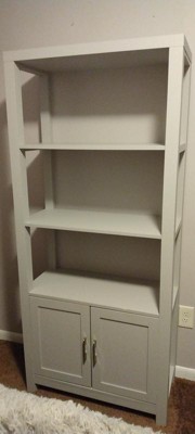 [This review was collected as part of a promotion.] This stylish bookcase is made well. It is made from far thicker wood composite than I had expected. The light gray is a pretty shade and goes well with my decor. It was very easy to assemble, just takes two people. I am disappointed that no matter how hard we tried, the doors will not sit level. There was a dented shelf board and one of the leg sides came scratched, along with some other minor flaws. I am looking forward to having it all styled with my knick knacks and collectibles. The shelf and cabinet options make it great for display and storage.