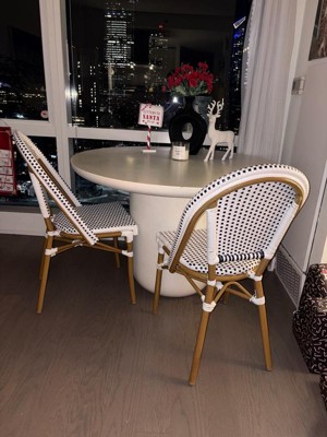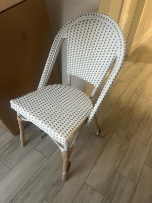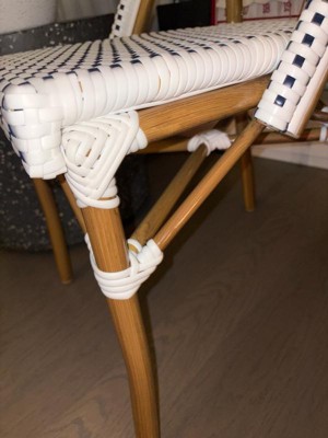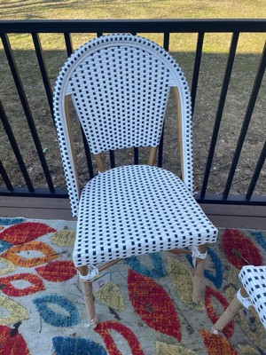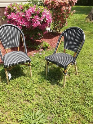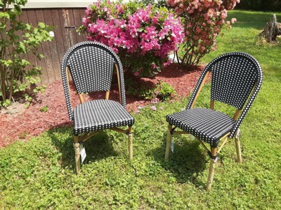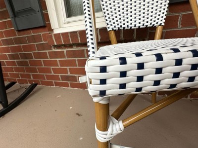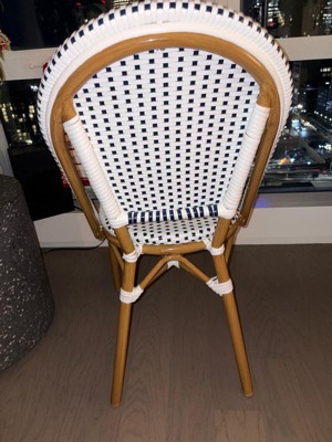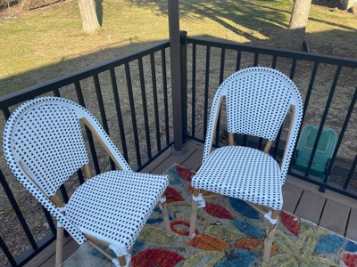 [This review was collected as part of a promotion.] I love these new bistro chairs. They go so well against my white siding I couldn't be happier. They are very sturdy, stackable and woven rattan, all things I look for in indoor/outdoor furniture. They are extremely comfortable and made with quality material. They have held up well in the weather! I am very happy with this furniture.