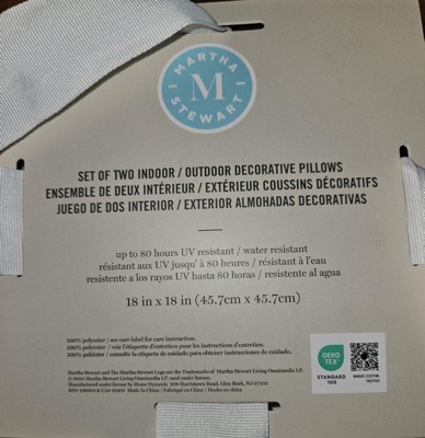 Bring comfort to your outdoor living spaces with the Martha Stewart Modern Banana Leaves indoor/outdoor decorative pillow 2-pack set. Printed with a modern tropical design, these pillows will add comfort and style to your outdoor décor. Use these decorative throw pillows indoors or outdoors, as they’re made with UV-fade and water-resistant materials and are soft for everyday use. This indoor/outdoor decorative pillow set includes two filled throw pillows made of 100% Polyester, making them easy to clean. Simply spot clean or handwash as needed for continued use in your home. Standard 100 by OEKO-TEX Certified.