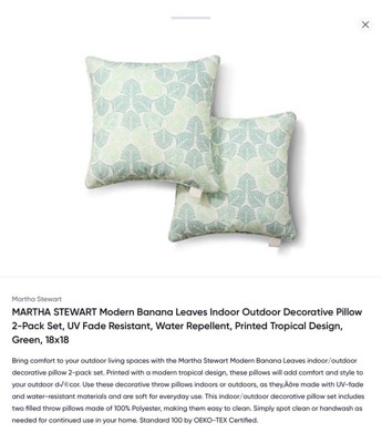 [This review was collected as part of a promotion.] I got the Martha Stewart Modern Banana Leaves Pillows and I am absolutely impressed with their quality. They are UV fade resistant which makes them perfect for the outdoors. The are a decent size and super comfortable. I decided to use them in my lanai and already planning on decorating everything to match them.