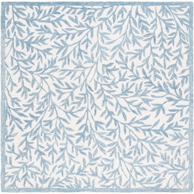 The rug features a serene ivory background, artfully complemented by an enchanting blue leaf pattern that exudes a sense of calm and sophistication. The square shape makes it versatile for various room settings, seamlessly integrating with both contemporary and traditional decor.