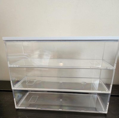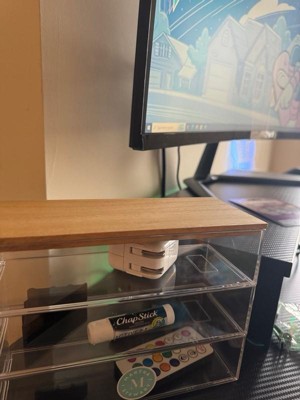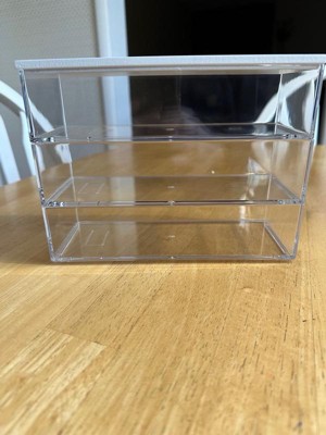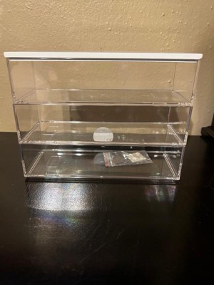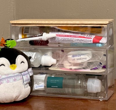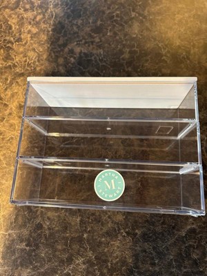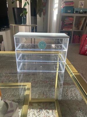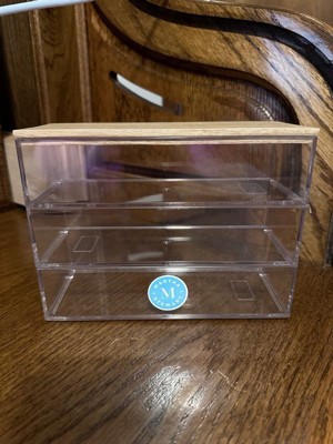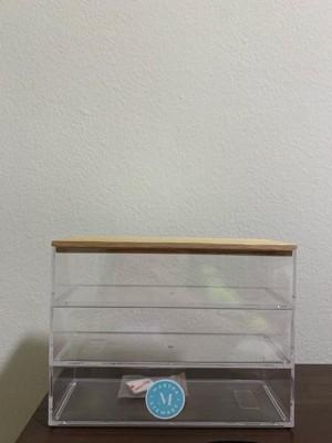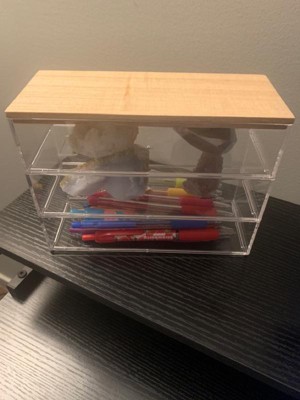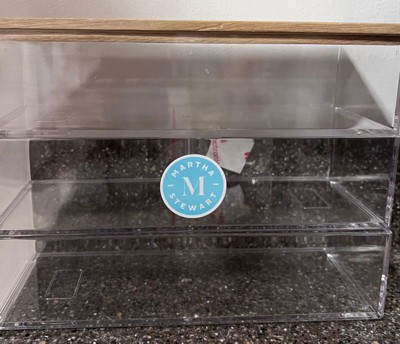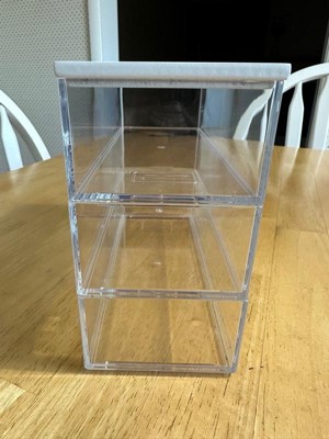 [This review was collected as part of a promotion.] I received the Brody Clear Plastic Storage Bins, and overall the product is well made. It came packaged very nicely, wrapped thoroughly so nothing was damaged or scratched during delivery. The 3 bins stack easily on top of each other, and do not slip or slide out of place. There are also 4 tabs you can place on the bottom to prevent the bins from moving once in their final location. The engineered white wood lid adds a level of “elegance” to the bins, so even if they were kept out on a counter they look very nice and not at all cheap. The plastic itself is thick, and is clearly well made as well. The size of the bins is smaller than I anticipated, which is my fault for not paying close enough attention to the dimensions. I did rate this product a 4 out of 5 stars because the bins are only accsssible if you unstack them- there is no pull out on the drawers, so you have to remove the top bin to access the bottom bin, and so forth. The bins are a great size for holding bathroom items, or in an office to store pens, etc. Overall, this product is well made, is aesthetically pleasing and therefore can be left out on a counter or desk, and is very stable. My only issue is that there is no pull-out capability for the drawers, thus requiring you to unstack the bins to get to the 2nd and 3rd bins.