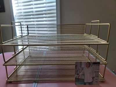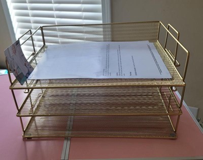 Martha Stewart Ryder 3 Tier Gold Desk Letter Tray Organizer, Stackable Steel Mesh Inbox Tray for Files, Papers, or Letters