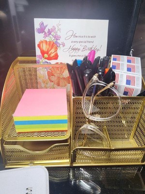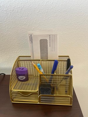 [This review was collected as part of a promotion.] I’m really happy with this desktop organizer! The mesh metal design looks very stylish and modern, and the gold finish adds a beautiful touch to my workspace. It’s compact but surprisingly spacious, with enough sections to neatly store pens, notebooks, papers, and small office essentials. Everything feels sturdy and well-made, and it helps keep my desk clean and organized. It’s both functional and decorative - a great addition to any home office or workspace.