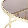Stagger your style with these nesting accent tables. Brass metal finish and smoke gray glass combine to enhance your contemporary flair. Stack close together for a stair-stepped look, or separate for double the design. This pair of accent tables adds the finishing touch to your modern living space.