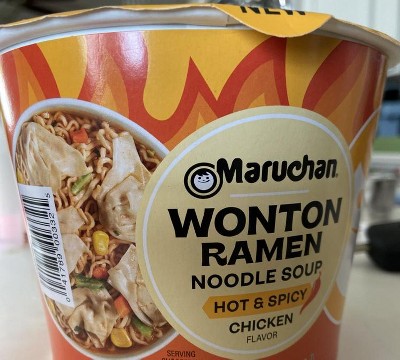 Hot & Spicy Chicken Flavor Maruchan Wonton Ramen Soup comes in a good size bowl and is easy to make. Large portions of ramen noodles and plump wontons in a rich spicy soup broth create an extremely satisfying meal. Habanero chili adds an extra kick!