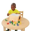 3 years & up. Placing different objects within the box to retrieve provides a wide range of tactile experiences from basic shape recognition to texture, size, and object discrimination. Chalkboard on one side and a write/wipe board on the other. Hardwood box has permanently attached, soft vinyl flaps at both hand openings. Feely objects are not included. Measures 10 3/4"L x 7 3/4W x 6"H.