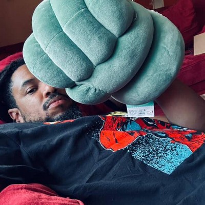 I really like this HULK FIST THROW PILLOW. I would wear it around my house more often, but the FIST is left-handed, and I’m left-handed, so I have to take it off constantly. So, it’s a nice pillow to relax with.
