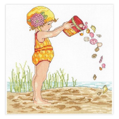 This little girl is having tons of beach fun with her bucket of colorful shells! "Bucket of Shells" is designed to be stitched on 14 count white Aida fabric and uses 25 different colors of floss. Includes: instructions, floss, fabric, needle  Finished size 9.1" x 9.6" Model Specifications Stitch count: 128 w x 197 h Project size: 9.1" x 9.6" on 14 ct Floss: 16 DMC floss colors