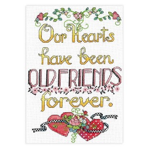 This wonderful sentiment is complete with colorful flowers and hearts! Design includes full stitches, quarter stitches, French knots and back stitching. "Old Friends Forever" is designed to be stitched on 14 count White Aida fabric and uses 15 different colors of floss.