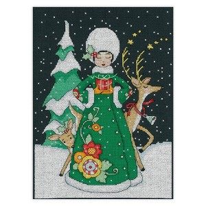 Stitch this wintery scene and the ultimate gift giver herself. "A Small Gift" is designed to be stitched on 14 count Black Aida fabric and uses 20 different colors of floss.