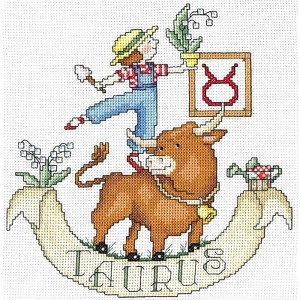 Honor the spirit of the Taurus with charming and down to earth project! Chart will be in black and white symbols with colored backstitch lines. Project includes full stitches, quarter stitches and backstitching. Taurus is designed to be stitched on 14ct White Aida fabric and uses 27 different colors of floss.