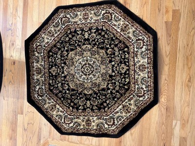 [This review was collected as part of a promotion.] This is a really fun spin on a traditional rug. It has a unique shape not often found, the pattern is very traditional but then it's also a dark color not often found in traditional rugs. I found it blended into multiple rooms in my house which then I had a huge debate where I should put it. The spot I intended to or in other rooms. It's not super thick but the weave seems really durable. It also hides stains really easily (thanks to my dog for knocking over my wine the very day I put it down).