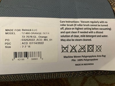 [This review was collected as part of a promotion.] I got this Jubilee Collection 5'x5' Round Orange Abstract Area Rug-Olefin Rug with Jute Backing because of its bold, abstract design and color scheme. I like the brightness of the orange coupled with the different shades of gray and clever use of the black as a continuous line to create interesting shapes. The overall design is clever and modern. The rug feels soft and padded under your feet, and my dog absolutely loves to lay on it and play. It is not only functional as a fun abstract area rug, but is like an art piece that is interesting to look at and fun. It easily transforms any boring, dull living space into an inviting and fun space to be in. The only thing is I need some non-slip rug pads or grippers to keep it stationary on my floor. Other than that, this is a great rug! It is well designed and well made. It is versatile in its use and easy to clean. Care instructions are attached to the underside of the rug and are straightforward and easy to follow.