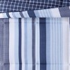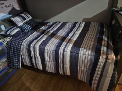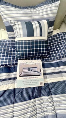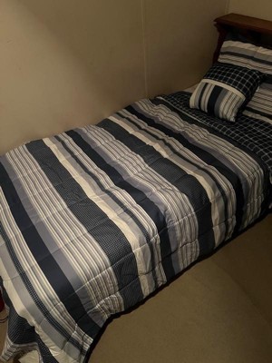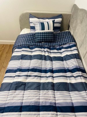 Classic stripe print with plaid textures in blues and whites help coordinate to your nautical theme room. This set comes complete with a decorative pillow to complete the top of the bed along with the sham(s). The reverse is a blue grid print in the same 100% microfiber fabric as the face cloth. Face and back cloth are printed 100% microfiber polyester with polyester fiber filling. This item is machine washable, but please be sure to use appropriate sized machinery to avoid any excess wear on the items. Includes: one comforter 68x86 and one standard sham 20x26 and one 16x16 inch decorative pillow.