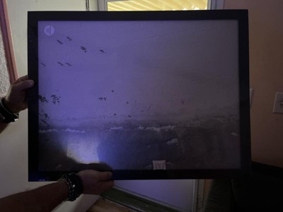 This black frame has a nice look to it. It is lightweight overall. It can be hung vertical or horizontal position. The polystyrene comes with a plastic cover on the front and the back side which can be peeled off easily. If the see through part is snowy, then there's still the covering film on it. The back has the hooks that swivel that go under the frame to keep the back locked in place. It was easy to hang too.