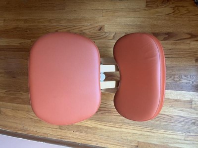 Pros: -Feels sturdy, the high weight limit and design gives me hope that it will last a long time. -Love that it is made of wood rather than metal. -The casters are a nice touch and it can be collapsed if needed to fit under a bed or vertically in a closet. Cons: -Really disappointed that the color is much more of a medical supply cranberry than a candy apple red like the product images show. -The angle that the chair sits you in from the knee down is more severe than other kneeling chairs that I have tried. I’m 5’5” and it’s mostly comfortable, but I could imagine taller people may have less success. -Came with a weird smell. The seat cushion needs to be assembled and I had to double check the product image to make sure I did it right as it did not come with directions. I needed a second hand to hold the seat in place while I screwed it on. -Quite creaky if I shift my weight to the side at all. Overall not what I expected considering there other options for much less.