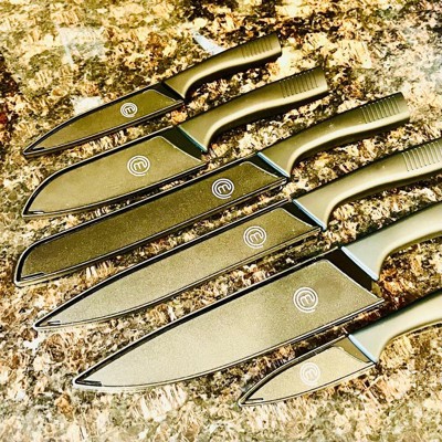[This review was collected as part of a promotion.] The set includes 6 knives. Each knife has its own protective sheath. The knives are razor sharp! The handles all have soft grips to make it gentle on your hands for cooking no matter the task! Peeling, dicing, prepping, slicing, cutting, and chopping. All your needs are covered! First thing I used these for was making some cinnamon apples in the Crock pot ... trying to get into that fall feel here in hot Florida. Cutting the apples was an absolute breeze and made my process quicker!