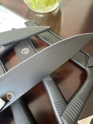 [This review was collected as part of a promotion.] I really like the covers to the knives for easy/safe storage. They were very sharp and were comfortable to handle. The all black look is very nice as well.