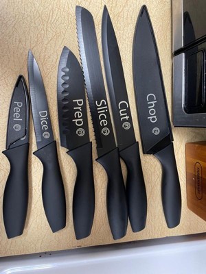[This review was collected as part of a promotion.] These knifes are a great value for their price. This kits has everything you would need for a kitchen knife set. I love the matte black coating- it looks expensive. The knives are really sharp. I best part is the comfortable handle shape and feel. I love that they come with safety covers.