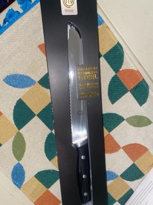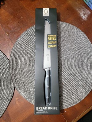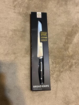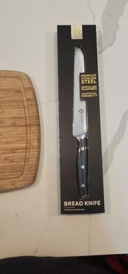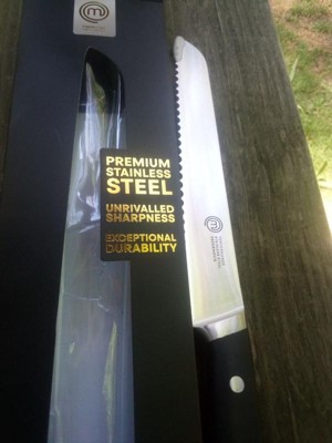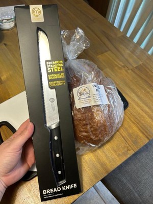 [This review was collected as part of a promotion.] I had a bread knife before this one, but the serrations were much wider and it had dulled overtime, making it it effective. I didn’t realize how bad that knife cut until I used this new one from MasterChef. It really does a very quick job of slicing bread and bagels, which are the hardest thing for me to cut. This is advertised as high carbon, but it’s a stainless alloy, which makes sense since edge retention is not as critical on a serrated knife, as it is a straight edged one. Very happy with the knife, the bolster is thick and there’s a weight to it. I’ll use this one for many years.