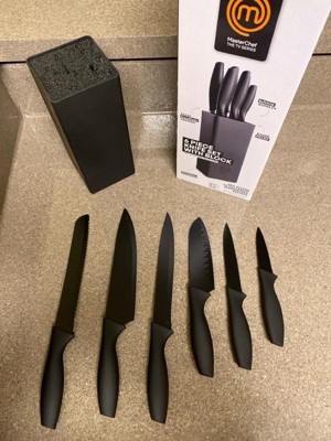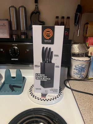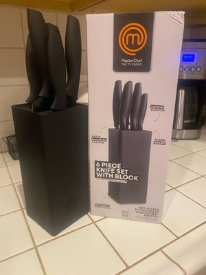 [This review was collected as part of a promotion.] I would like to thank Influenster and MasterChef for the opportunity to take part in their Six Piece Knife Set Campaign. I was given this knife set free of charge and return for an honest review and here are my thoughts. First and foremost I want to talk about the look I love the set because with the black blades and the black handles it looks very sleek and it matches the decor in my home number two I love how sharp and how efficiently the blades cut through carrots lettuce cucumbers they've been a blessing to have around the house. When I moved from my grandparents I left a lot of my good cutco knives so it is nice to have these. Another thing I love that the butcher block has extra space to put even more knives. I would like to thank MasterChef for designing such a beautiful little knife set. Thank you influenster and thank you MasterChef I appreciate it