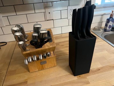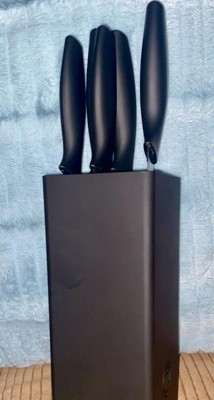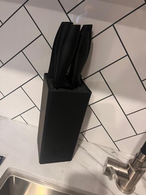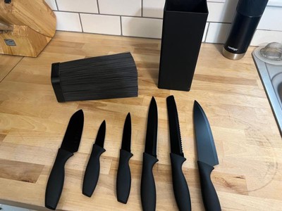 [This review was collected as part of a promotion.] Super impressed with this knife set. They are sharp and cut very well. I like the black design as it’s very sleek in my kitchen. They seem very durable. They have an interesting holder which has a spaghetti type insert. The knives do not have a specific place in the holder.