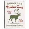 Christmas Farm Sign Collection B by Victoria Barnes is a beautifully crafted painting that showcases the sign "Rudolph's Reindeer Treats since 1865." At the center of the canvas stands a forest-green colored male reindeer, proud and majestic, with twig-like antlers that add a whimsical touch. Beneath this central figure are the words "Distributed by North Pole Imports," enhancing the festive theme and adding a magical, North Pole feel to the piece.