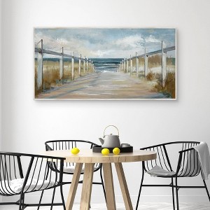 Over the Dunes By Studio Arts guides the viewer along a wooden pathway stretching from the shore to the beach. Flanked by rustic railings and overgrown grass, the path invites one to explore the sandy expanse that lies ahead. The artwork beautifully captures the transition from the rugged shore to the serene beach, with the sea and its crashing waves visible in the background, drawing the eye to the horizon.