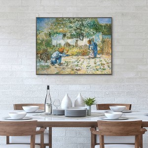 Immerse yourself in the profound beauty of family love with First Steps by Vincent Van Gogh. This enchanting painting captures an intimate and touching moment where a father, on his knees with arms outstretched, eagerly awaits his child's first steps, while the mother lovingly steadies the toddler. The discarded shovel beside the father hints at a pause in daily chores, highlighting the importance of this precious family moment.