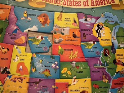Very unhappy with size of puzzle pieces and misleading description of the puzzle. Pieces small and states hard to read. It is nothing like the pictures or description. Thinking of returning. I will not buy anymore puzzles from Target, seems Target has an issue with misleading information on sizes and quality.