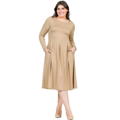 24seven Comfort Apparel Maternity Midi Length Fit N Flare Pocket Dress-Wheat-S