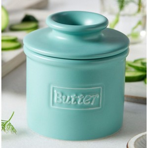 Fresh and contemporary, the Café Matte Aqua Butter Bell® Crock adds a cool pop of color to your kitchen. With raised butter and beurre lettering, this ceramic crock blends café charm with modern simplicity. The matte finish offers a soft, understated look that complements today’s kitchen styles. Using the traditional French water-seal method, it keeps butter soft, fresh, and perfectly spreadable without refrigeration.