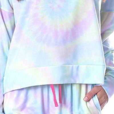 SHORTENED HOODIE STYLE TOP - This comfy soft jogger pajama set features the Barbie logo on a rainbow tie dye background. The pants also have an extra long waist tie (so you won't lose it in the wash). This hooded jogger pj set is both comfortable and functional, it is made of a polyester spandex blend that allows it to wear well but also be stretchy and comfortable. The top has a shortened oversized hoodie look with an extra soft hood and the the pants are joggers with two extra deep pockets hidden in the seam to carry your phone or keys. Any fan of Barbie will love relaxing in this fun set