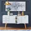 Wow your guests with the statement of The Maura Buffet from Buylateral. Mid-century design inspired details such as natural angled cone legs and sleek gold tone drawer hardware is complemented with a crisp clean white finish. This cabinet offers various storage compartments making it ideal for organizing linens, cutlery, dinnerware, serving pieces and more.