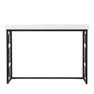 Invite a modern look into your home with this two-tone entryway table. A spacious glass tabletop displays family photos and curated decor while the contrasting metal frame crafts a contemporary design. Open side panels feature interlocking squares creating an Asian-inspired feel. Add the finishing touch to your decor when you place this unique console table in your entryway or living space.