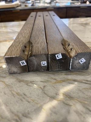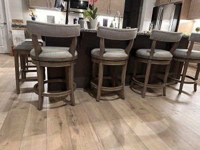 We bought the stools in the Reclaimed Oak Finish with Ronan Stone Vegan Leather and they are perfect for our space. Very comfortable and well made, especially for the price. The vegan leather is so soft and easy to wipe off. Highly recommend!