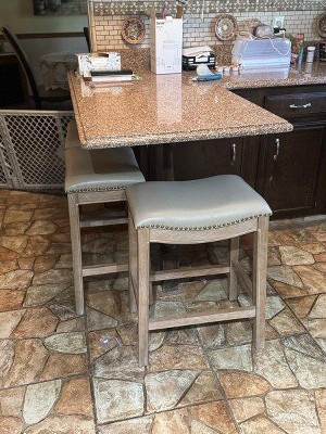I love the look of these stools and I have received many compliments. They are sturdy and comfortable. The vegan leather is soft to the touch. I would purchase these again.