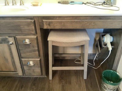 I like the color of the wood and the upholstery. It seems sturdy. The height is good for my vanity. We are having trouble getting the screws to pull the braces tight. They may not be long enough. We have eighth inch gaps in each of them. I think the glue is what's holding them in right now. We are going to work on it again.
