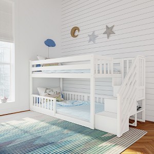 This best-selling Twin Low Bunk Bed With Stairs from Max & Lily features a space-saving design perfect for smaller spaces, with the bonus of add-on safety guard rails for the bottom bunk to discourage rolling or falling out of the bottom bunk. These rails can be added or removed to and from the bottom bunk over time and as needs change. The top bunk features built-in extra tall, 14” guard rails. With solid, knot-free New Zealand pine wood construction and a high 400-pound weight capacity per sleeping surface, the design is safe and secure for kids. The bed safely fits standard twin-size mattresses up to 8 inches thick. The bottom bunk sits only two inches off the floor, making it the perfect sleep option for little ones. The safety guard rails added to the bottom bunk are 13.25 inches tall and can be removed as your child grows. Please note that while add-on guardrails rails can help restrict access and give a sense of protection, they do not prevent all accidents or injuries. Only for use on bottom bunk/bed. Must be attached to the bedpost. Do NOT use an add-on guardrail in place of or to extend the height of the guardrails provided with your Max & Lily bunk or loft bed. Guardrails are for ages 36 months and older. The staircase with anti-slip steps is the perfect bed entry option for younger children. Added bonus – the stairs can be used on the left or right side of the bed. Easy to maintain and long-lasting low VOC finish. Flush, matching hardware creates a clean look. This bed meets or exceeds Federal safety standards for children’s furniture. Instructions, upper/lower slat rolls, and required hardware are included. 2+ adults makes assembly easier. Bed ships in two boxes and is heavy due to solid wood construction. Guard rails ship in separate boxes.