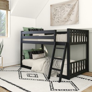 - Space Saving, Modern Bunk Bed: Solid wood twin-over-twin low bunk bed opens up floor space; Versatile ladder can be installed on either the left or right side of the bunk bed for the perfect fit; Slatted headboard and flush, color-matched hardware offer a clean finish
