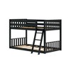 - Total Footprint: Twin low bunk bed measures 80” L x 54.5” W x 50.25” H; Ideal for low ceilings, low-profile bunk on the floor measures 50.25” high with an underbed height of 31”; Bottom bunk rests 2” off the floor